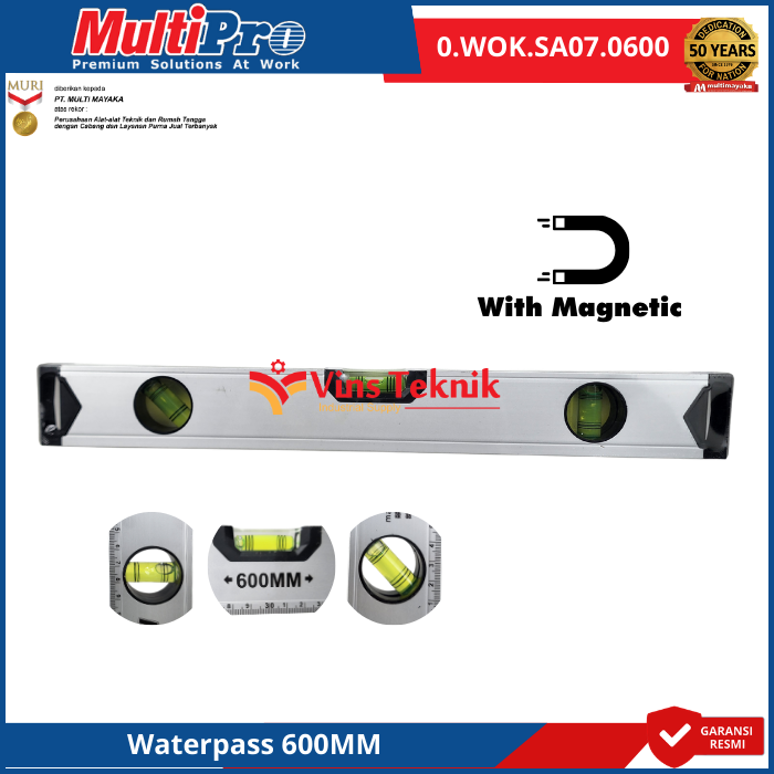 Waterpass Multipro 60cm (EM-42) adalah alat pengukur kerataan (spirit level) berbahan aluminium yang kokoh dengan panjang 60 cm (24 inci). Alat ini dilengkapi dengan magnet untuk mempermudah pemasangan pada permukaan besi, serta memiliki 3 vial (gelembung) untuk pengukuran horizontal, vertikal, dan diagonal, cocok untuk pekerjaan konstruksi dan pertukangan.