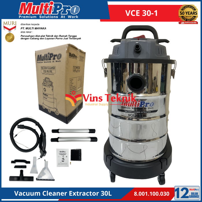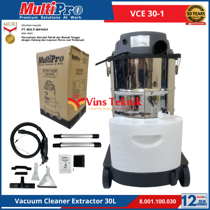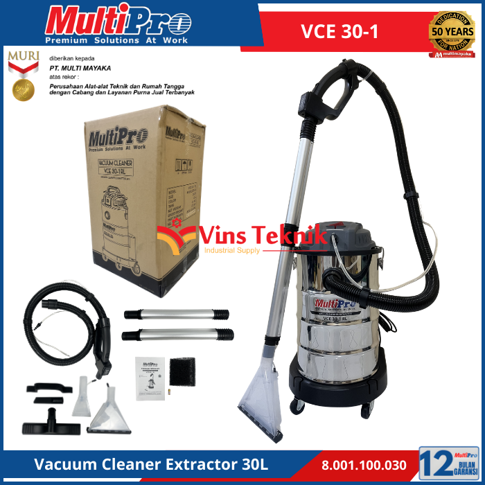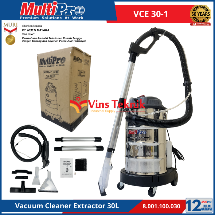 kapasitas tangki... Read More MULTIPRO VCE 30-1 adalah penyedot debu dan ekstraktor serbaguna berkapasitas 30 liter yang dirancang untuk membersihkan kotoran basah, kering. cocok untuk penggunaan di rumah, kantor, hingga keperluan profesional seperti cuci karpet dan sofa.